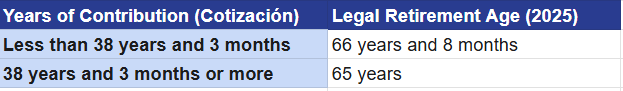 The legal retirement age depends directly on the number of years you have contributed (cotizado) to the Social Security system. For 2025, two scenarios apply: