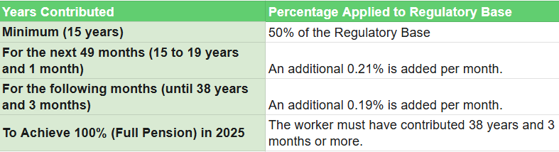 Once the Regulatory Base is obtained, a percentage is applied based on the worker’s total years of contribution: