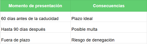 Si presentas la solicitud dentro de los 60 días previos a la caducidad, todo sigue su curso normal. La normativa permite presentarla hasta 90 días después, pero puede conllevar una sanción económica.